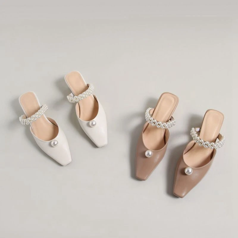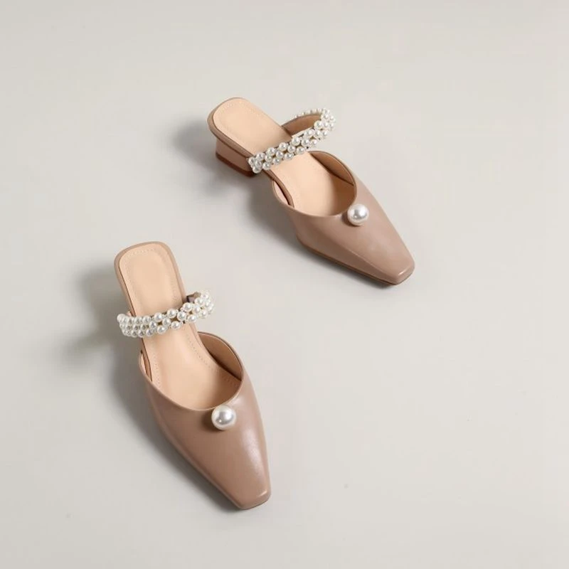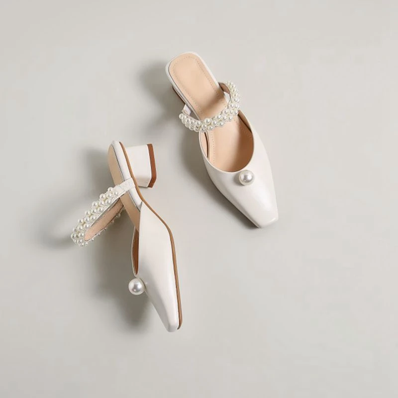 Special Offer 奪う猫2021新パールスリッパ女性本革ハーフ正方形つま先のファッションエレガントな3.5センチメートルmidかかと女性サイズ33-42 B2615 Discount (45%OFF) Today!