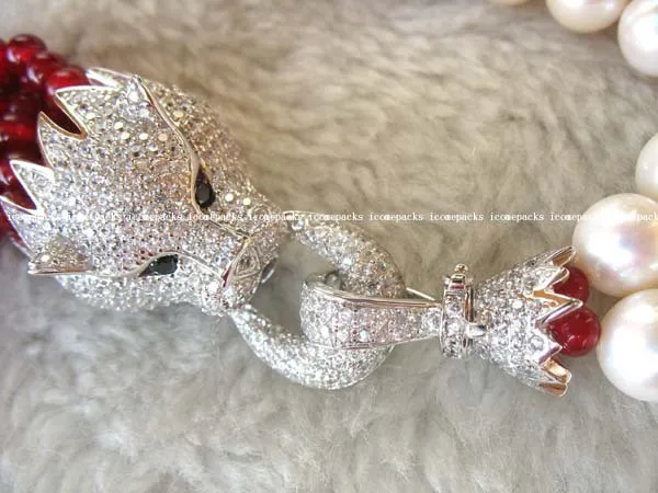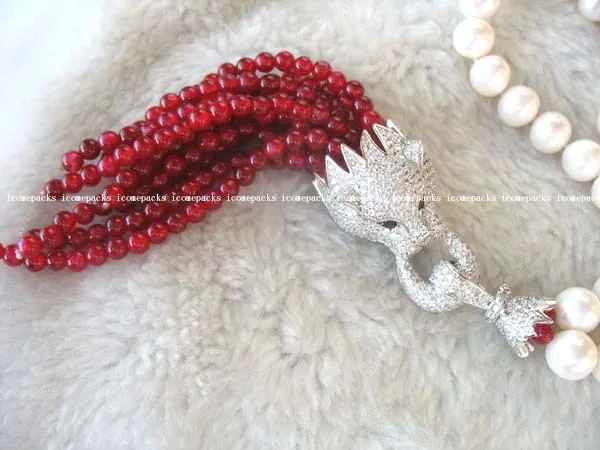 Special Offer 卸売9-10ミリメートルホワイトラウンド淡水真珠とczヒョウクラスプ4ミリメートル赤瑪瑙ネックレス18" Discount [NEW!!] Today!