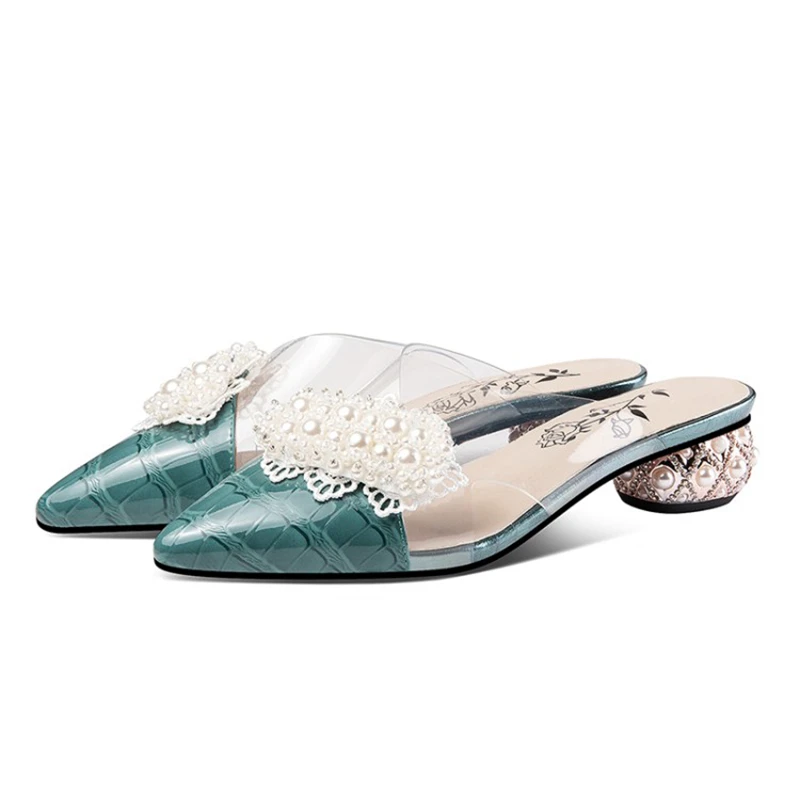 Special Offer 奪う猫2021本革ラインストーン女性のスリッパワニテクスチャ花光沢のある奇妙なヒール4.5センチメートルUS12ベージュA4236 Discount (45%OFF) Today!