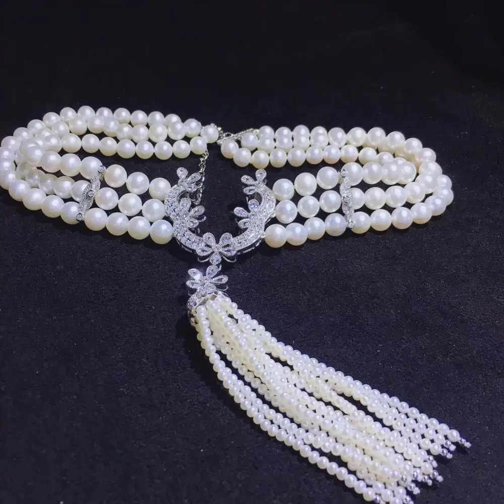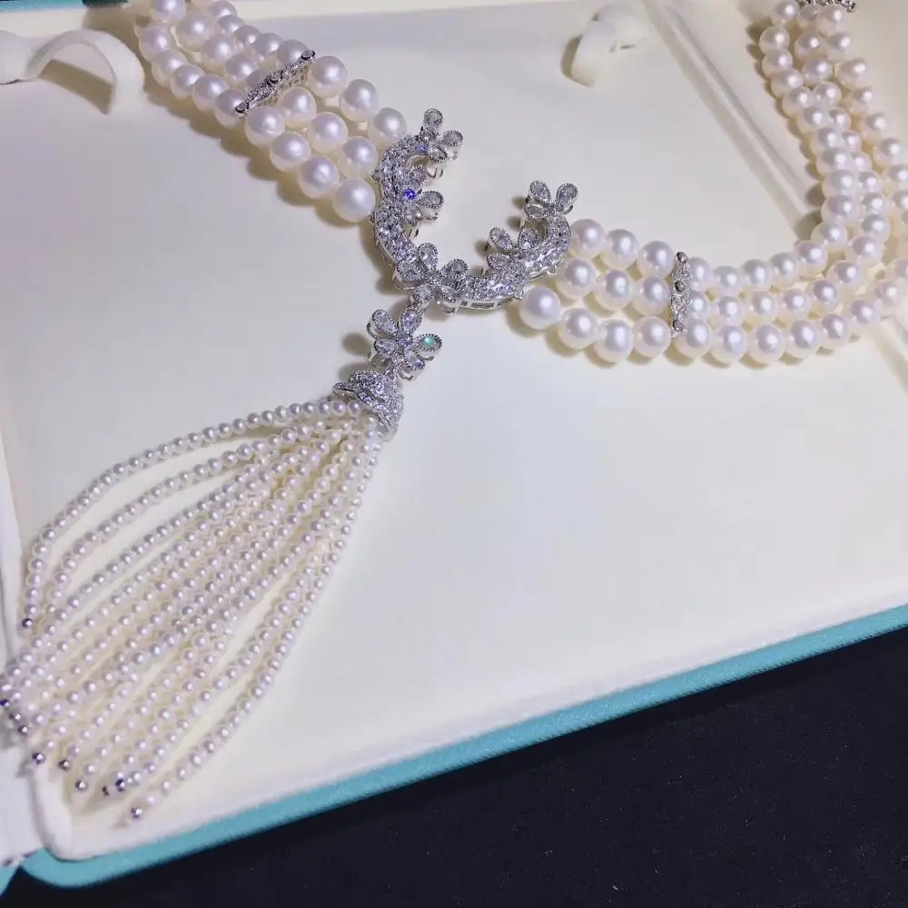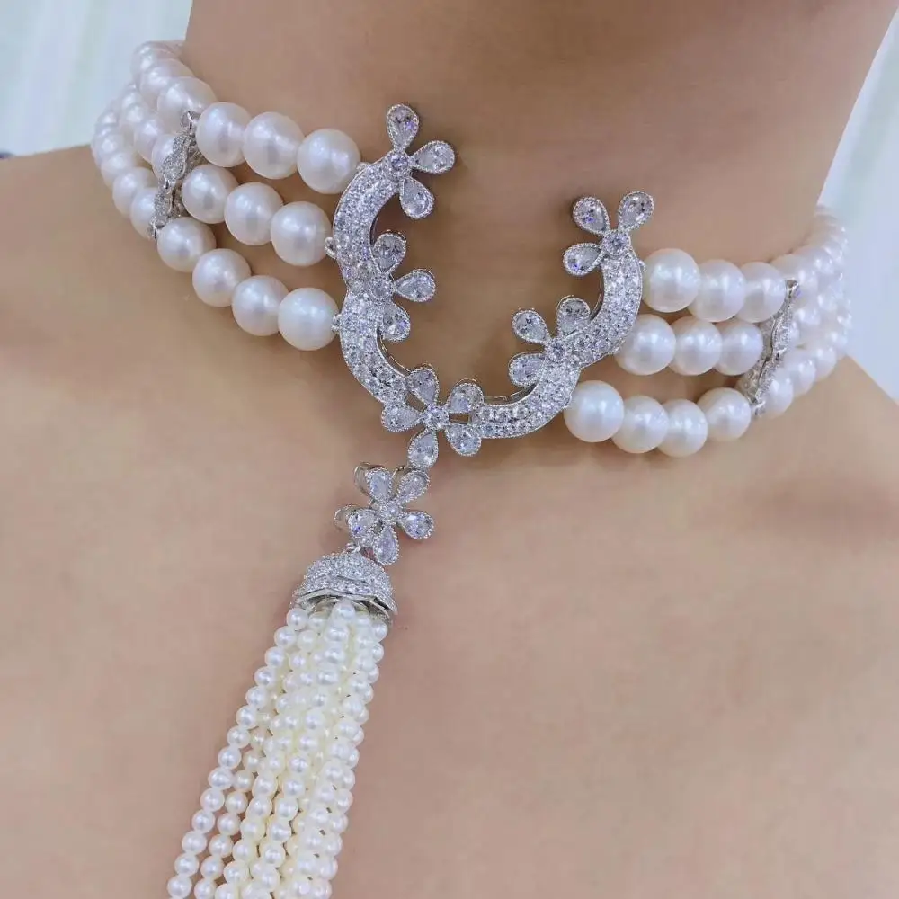 Special Offer 8-9 ミリメートル天然淡水真珠チョーカーネックレスマルチレイヤ 925 スターリングシルバーキュービックジルコンタッセル注文受け入れる任意の長さ Discount [NEW!!] Today!